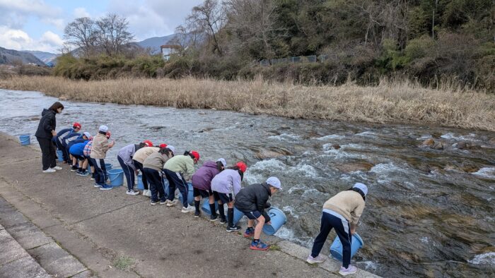 3月10日、布野川において「ヤマメ放流体験」を実施しました。