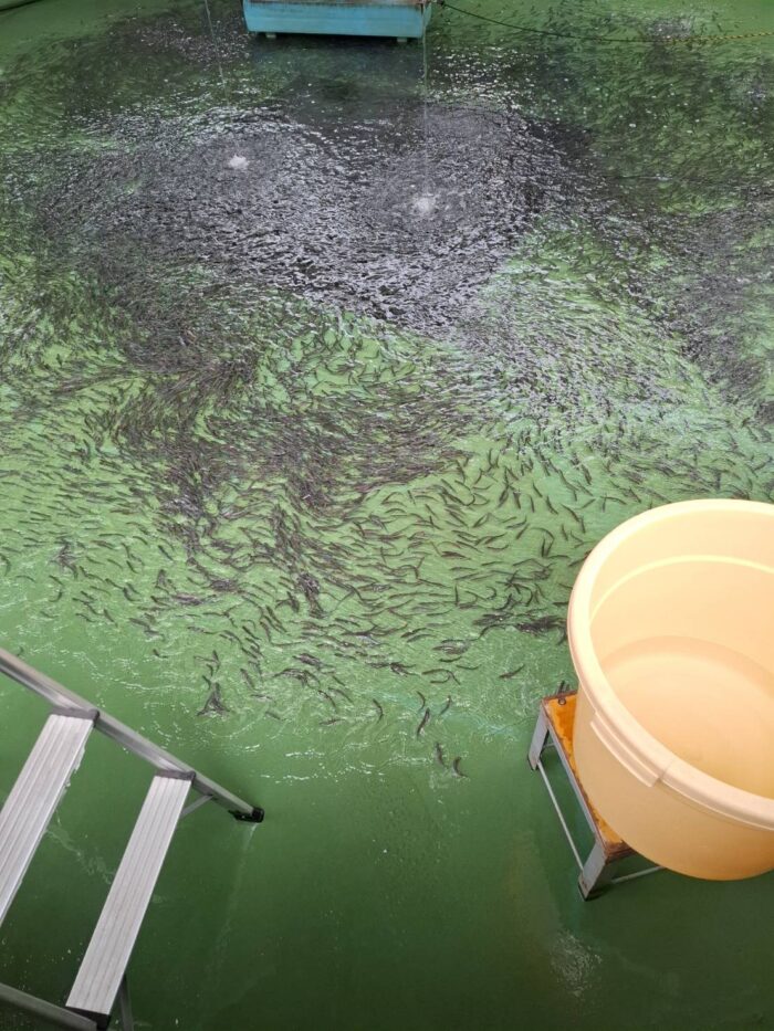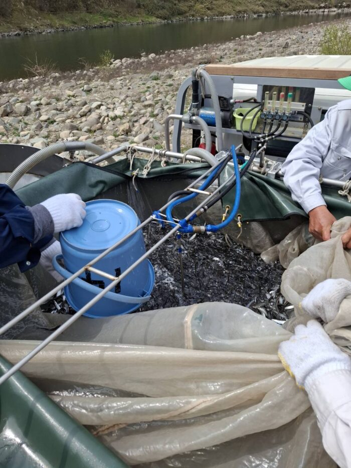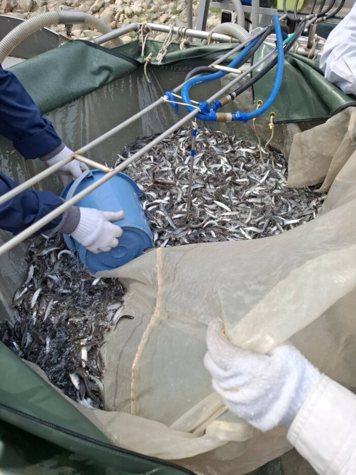 今回放流したのは、当組合で中間育成した広島県産の人工種苗で、体長7~8センチ、体重約5グラムの元気いっぱいの稚アユです。